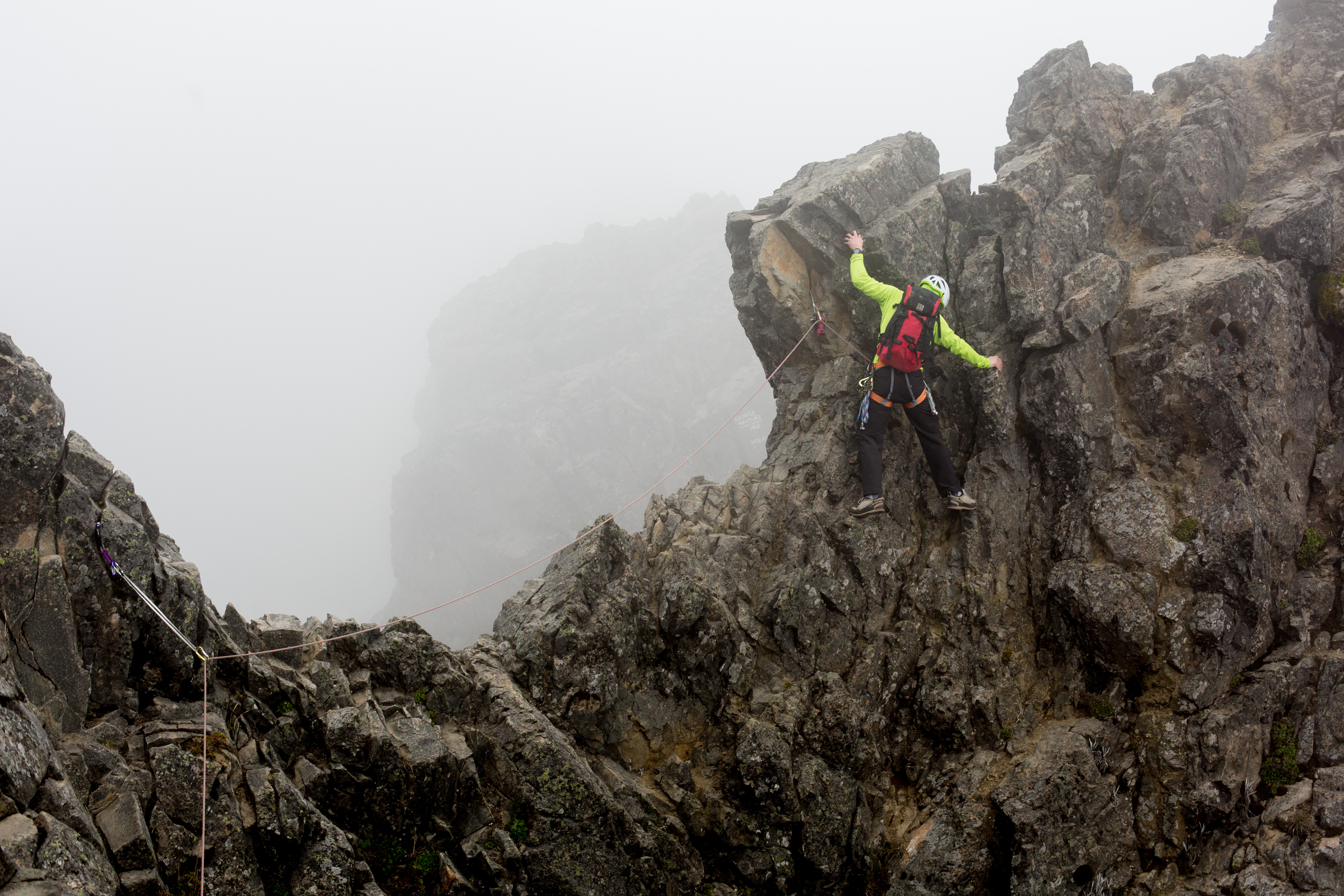We decided to forgo the normal route and opted for the “Paso de le Muerte” or “Window of Death”. This route leaves the normal trail after an hour and a half and scrambles up 5th class terrain on Rucu Pichincha’s East ridge. We climbed for an hour and a half on 3rd-5th class terrain hooting and hollering and snapping photos the whole way until we reached the summit or “Cumbre.” When the clouds roll in, as they do everyday around 1PM or 2PM, the climbing quickl